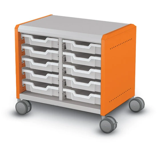 - Ten 3″H translucent polypropylene totes operate on runners with safety stops to prevent content spillage.
