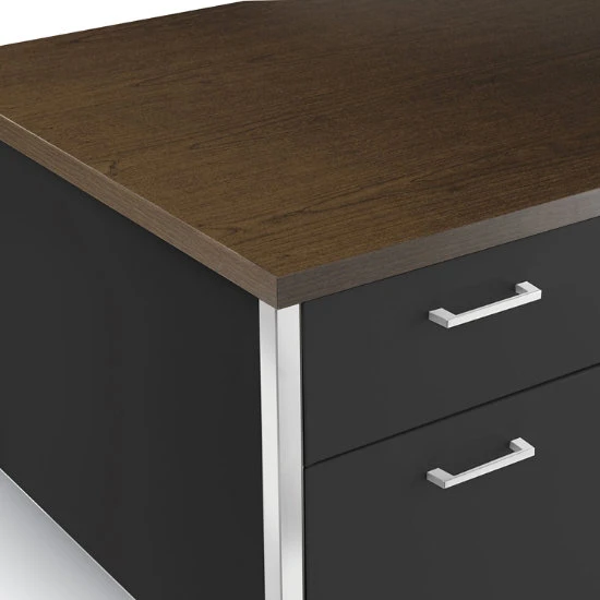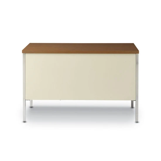- Steel base includes pencil, supply, and file drawers with 3/4-height modesty panel in powder-coat paint finish.