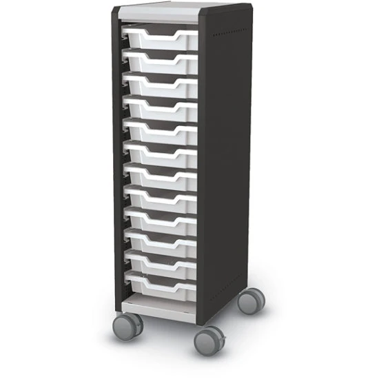 - Twelve 3″H translucent polypropylene totes operate on runners with safety stops to prevent content spillage.