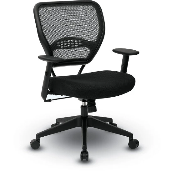 - Mesh back with built-in lumbar support and 3-1/2″ thick padded fabric seat.
