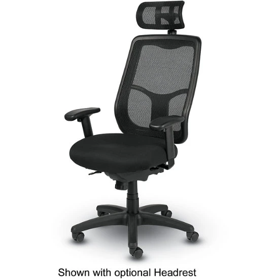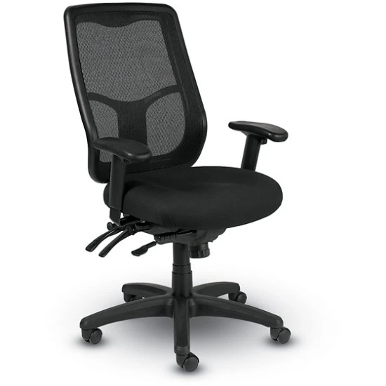 - Black mesh back and comfortably padded fabric waterfall seat.