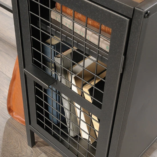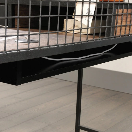- Solidly built with Vintage Oak laminate worksurfaces, with black powder-coated metal base.