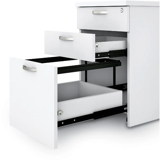 - Includes two supply drawers, and one file drawer able to accommodate letter or legal-size hanging files.