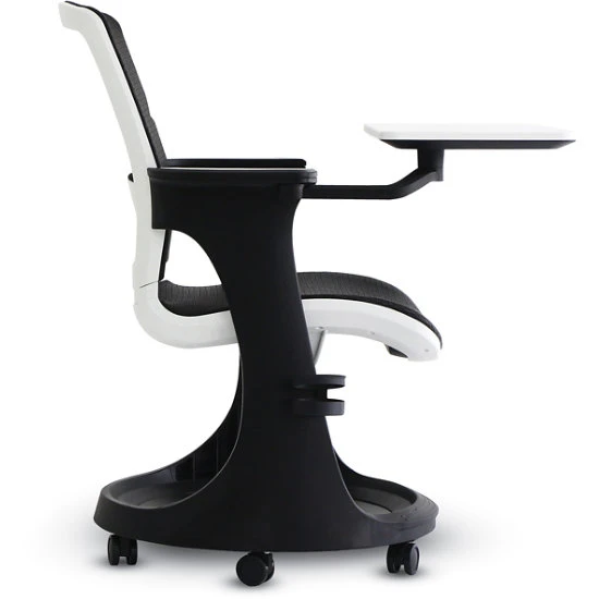- Features fixed polyurethane padded arms with right-hand swing-out white laminate worksurface.