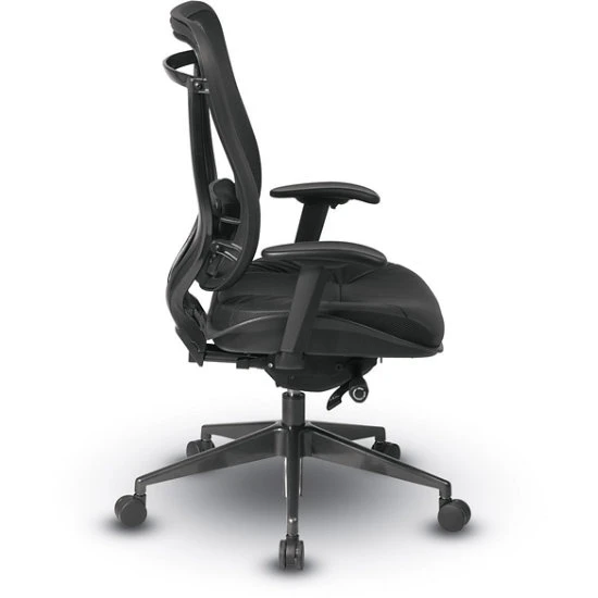 - 3″ thick, black top-grain leather seat equipped with seat slider and one touch pneumatic height adjustment.