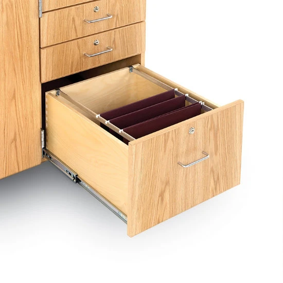 - Two utility drawers, one letter-size file drawer and pull-out writing board; all drawers lock.