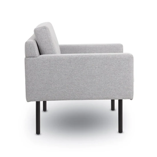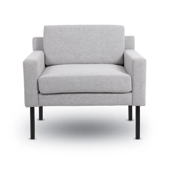 - Seating area is fully upholstered with gray poly-linen weave fabric for softness and durability.