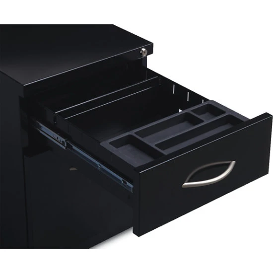 - Locking pedestal features full-extension drawers with precision ball-bearing suspension, and counterweight for safety.