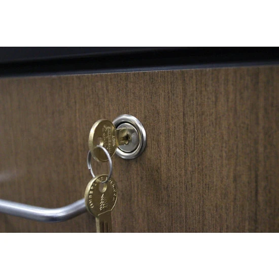 - One pedestal has two supply drawers and one letter-size file drawer with 4″ wire pulls in satin nickel finish, and steel ball-bearing glides; single lock secures all drawers.