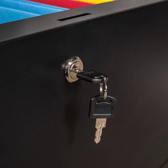 - Features letter/legal-size hanging file storage with flip-up top surface and lock to ensure security.