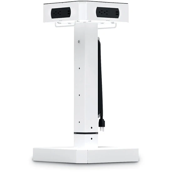 - Bright white powder-coated steel tower with built-in cord wrap, and 12′ power cord.
