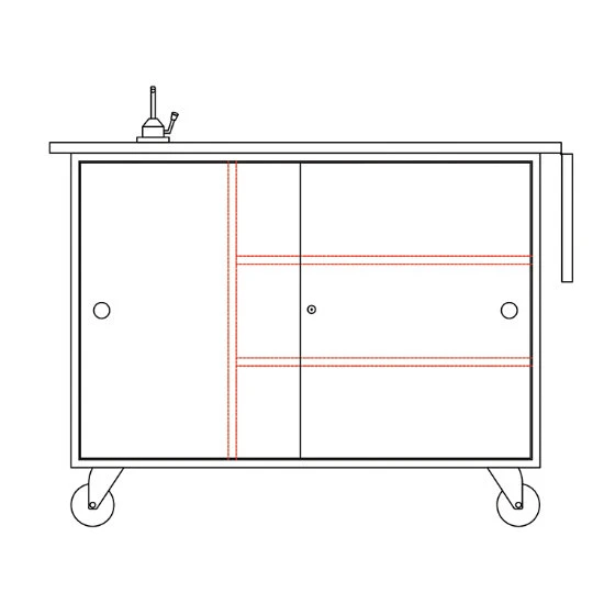 - Locking sliding door on aluminum glides has off center divider with open storage on sink side and 3-shelf storage area on adjacent side (2 shelves adjust in 1-1/4″ increments).