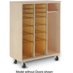 - Left two columns include six 3″H, six 6″H, and two 12″H high-impact polystyrene translucent totes operating on glide-n-tilt tote runners to prevent spillage when in an open position.