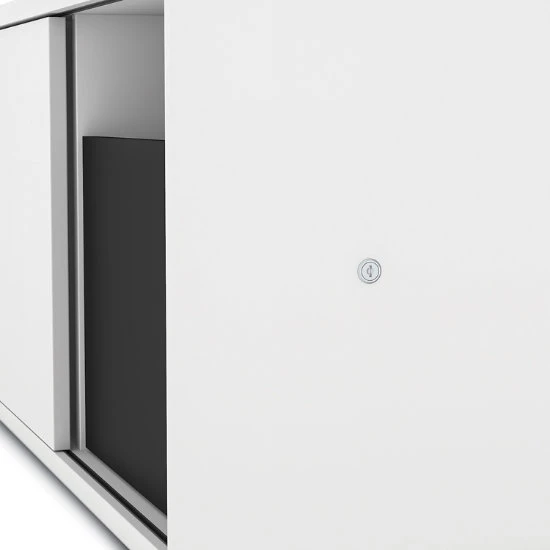 - Storage credenza includes sliding door with two shelf storage on one side (one shelf adjusts), plus recessed letter/legal-sized file drawer with side lock, and paper shelf on the other side.