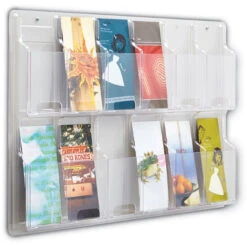 - One-piece thermoformed plastic with pockets able to hold 1-3/4″ of printed material.