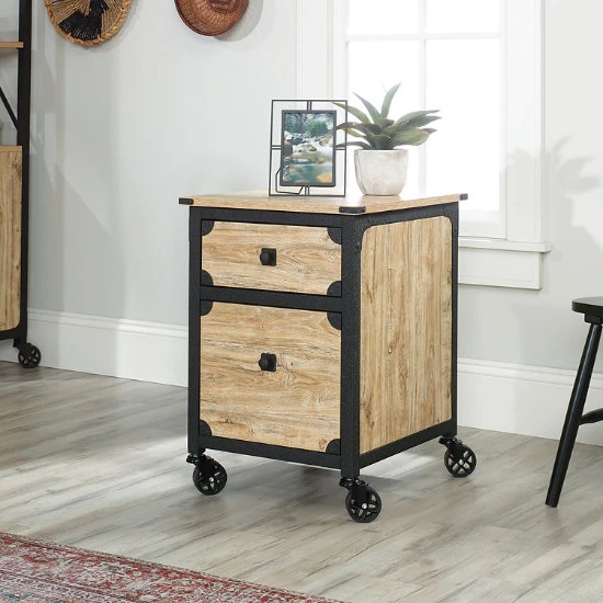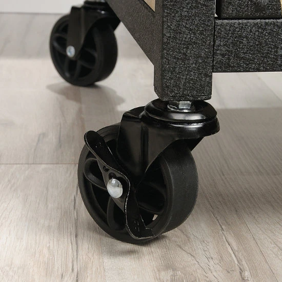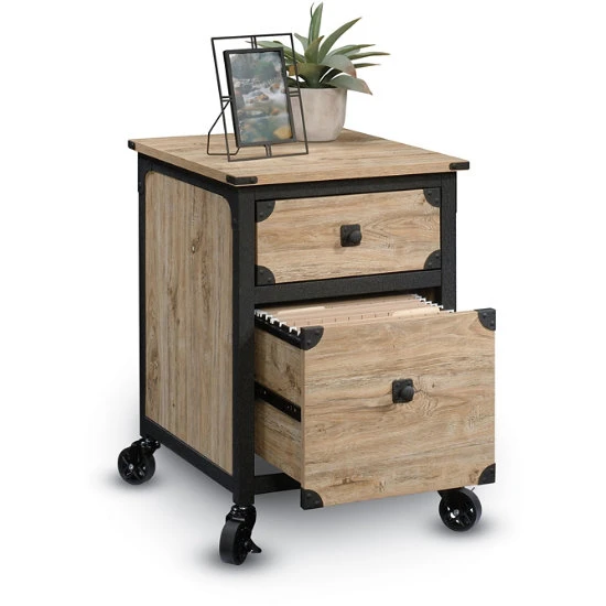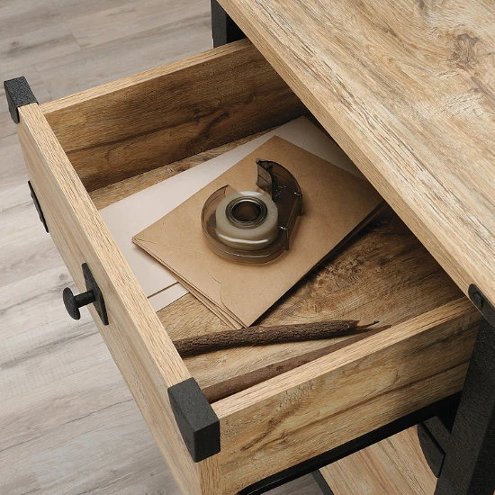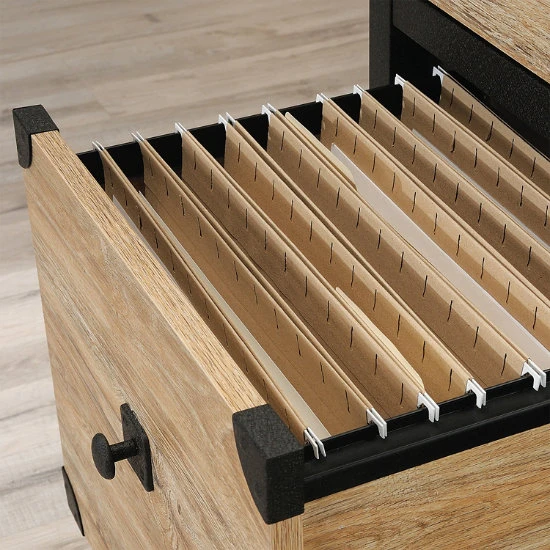 - Supply drawer has metal runners with safety stops; file drawer with full-extension metal slides accommodates letter-size hanging folders.