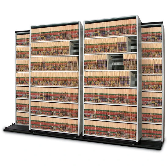 - System includes five 7-tier file cabinets (three stationary; two mobile) with overhead anti-tip mechanism for greater stability and powder coat paint finish, three shelf dividers, and one backstop per shelf.